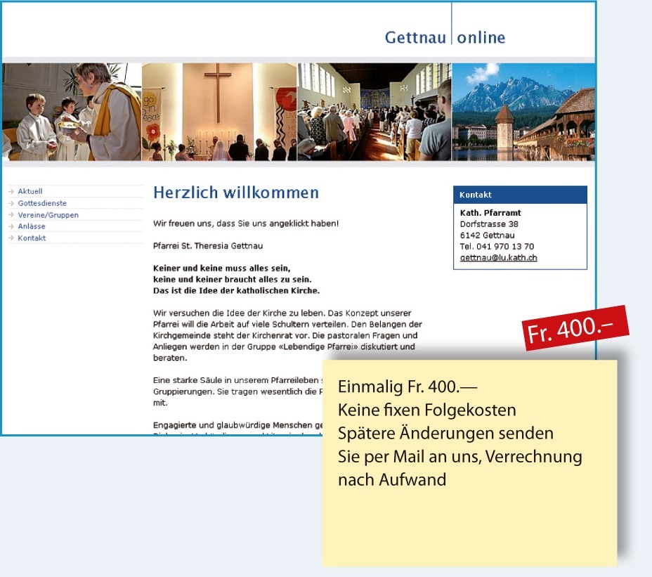 Ihre Möglichkeiten sind beschränkt, Sie wollen den Pfarreimitgliedern aber die wichtigsten Kontaktdaten online zur Verfügung stellen. Wir erstellen für Sie zwei Seiten nach vorgegebenem Layout und verlinken diese auf der Plattform «Luzerner Pfarreien online». Sie erhalten eine eigene Webadresse (URL), z.B. www.luzerner-pfarreien.ch/gettnau