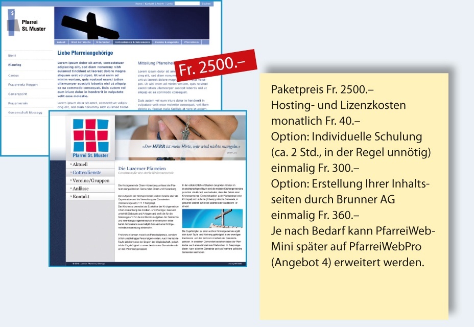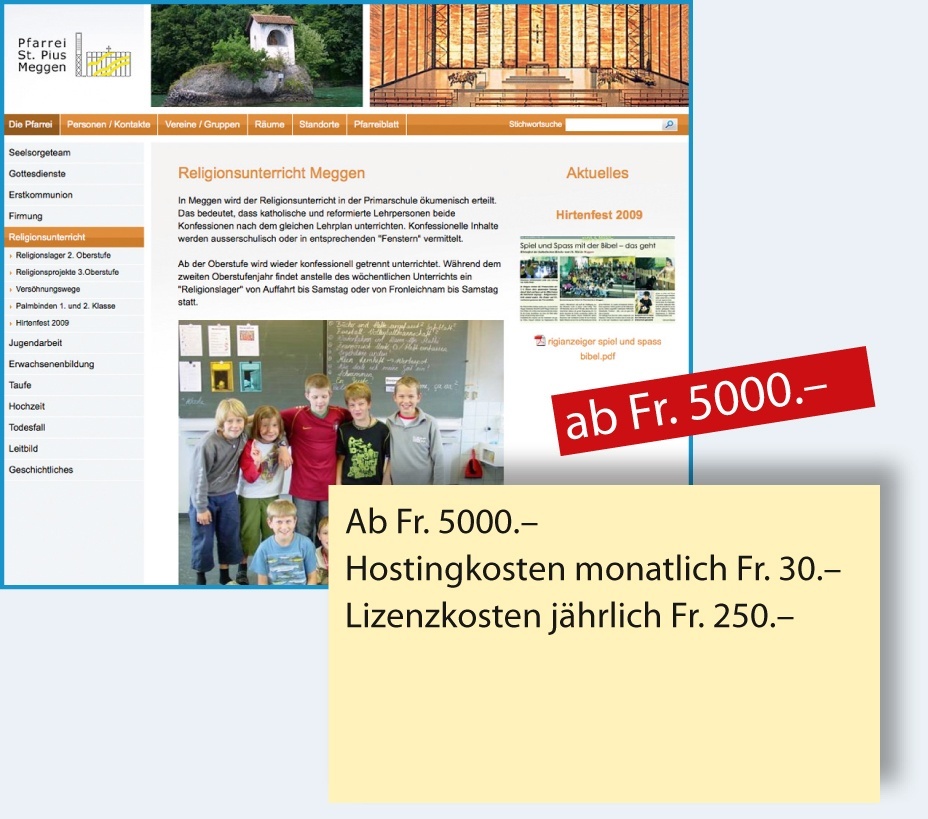 Die professionelle Lösung für Ihre Pfarrei. Wir erstellen für Sie Ihren individuellen Internetauftritt. Gemeinsam entwickeln wir das Design, erarbeiten die Struktur und erstellen Musterseiten. Bilder und Texte können Sie selber erfassen – Bildgalerien und Diashows gehören zum Standard. Der Umfang der Seiten und Navigationen ist fast unbeschränkt. Bei einer persönlichen Schulung lernen Sie alles kennen, was Sie für den Unterhalt Ihrer Website wissen müssen.